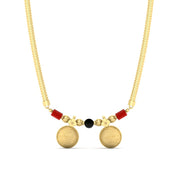 The black beads perfectly complement the vibrant colors of the saree or classic ceremonial attire, while the gold chain designs add elegance. Women often choose elaborate thali designs to enhance their festive attire to showcase conventional elements. These pendants often feature intricate motifs that resonate with cultural significance, making them perfect for weddings and celebrations.